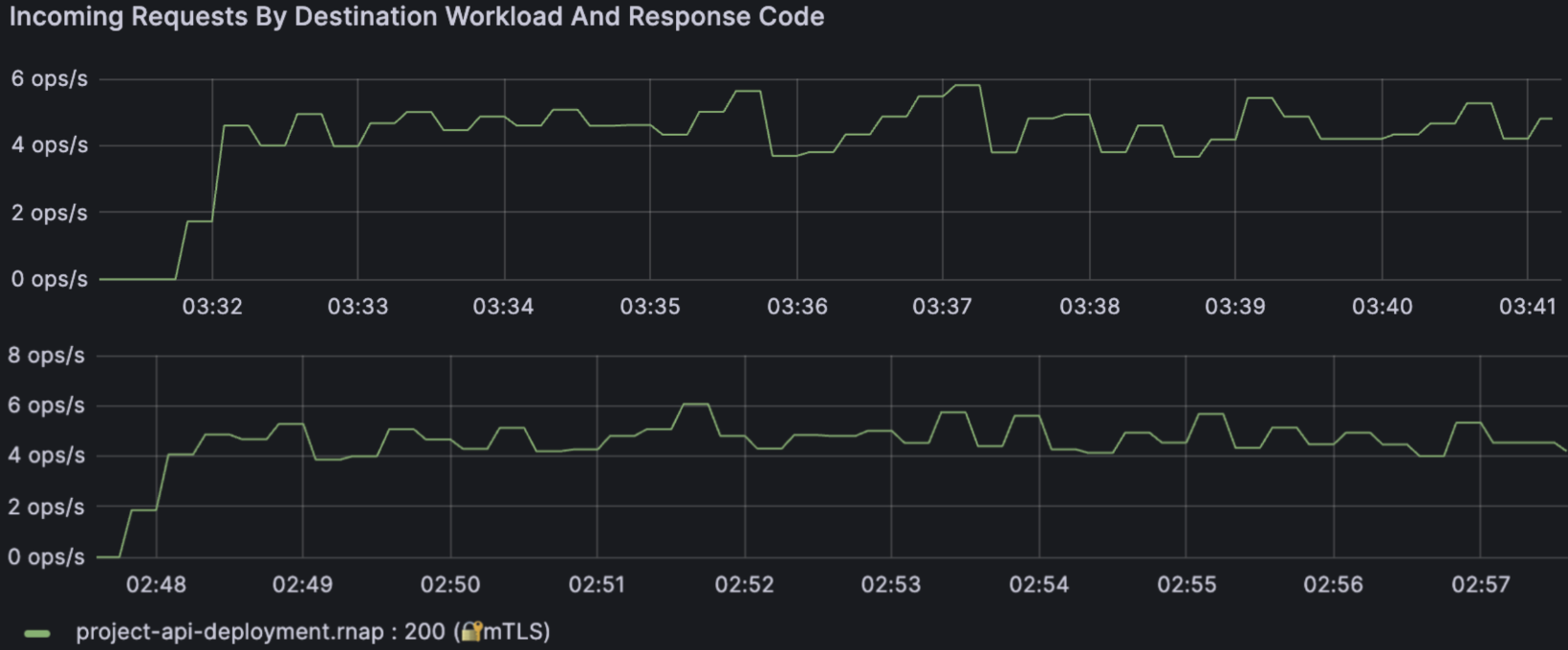 For a real multi-service mesh with many callers, the "by source" views would be critical to identify noisy neighbors or misbehaving clients. In this controlled, single-client benchmark, they're redundant - so I focus on the three panels that directly support the caching story: request volume, request duration, and request size.